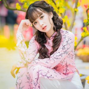 棕色双马尾卷发粉色旗袍少女的新春祈福越南花市看蜡黄梅花