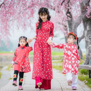 棕色双马尾卷发红色旗袍少女越南赏樱花