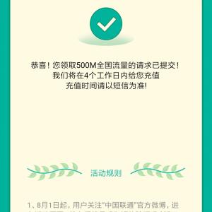8月1日新一期的联通新浪微博送流量活动开始啦,进入新浪微博,搜索 中国联通,点左下角 +关注,点联通流量银行,输入手机号和验证码,点领取,即可领取500M全国流量,4个工作日内到账。小希需要提醒大家的是:该流量包为后置流量包,当主套餐流量用完后,才会消耗这500M流量哦!