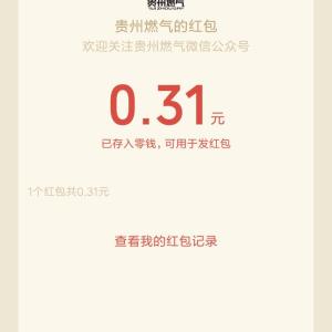 进入微信,点右上角+,添加朋友,公众号,搜索 贵州燃气,关注后,会自动收到一个红包,点红包消息,可领取随机金额的现金红包。小希领到了0.31元。大家可以试试运气,金秋活动关注红包数量有限,先到先得!