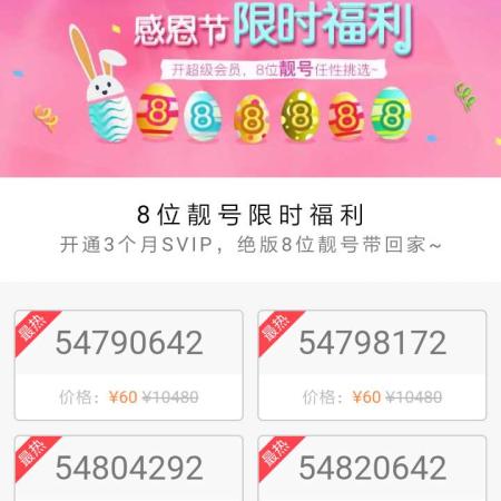 进入手机QQ,点头像,点 我的超级会员,点页面中间的红色 会员好礼 字样,点 感恩节限时福利,选择 任意绝版8位靓号,开通3个月SVIP领取。领取的靓号需保持SVIP身份。