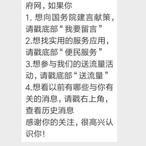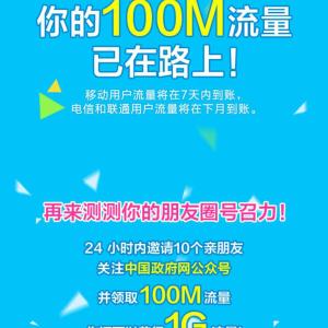 进入微信,点右上角+,添加朋友,公众号,搜索 中国政府网,关注后,点右下角 送流量,直接领流量,关闭Wifi,开启数据网络,点 领取流量,可领取100M流量。移动用户流量在7天内到账,电信和联通用户流量将在下月到账。点此再领300M流量。
