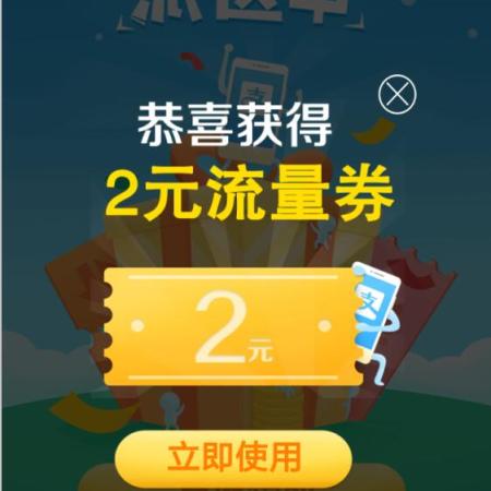 用支付宝扫描二维码,可以领取一张2元流量券,领取后,点 立即使用,满100M流量即可抵扣,还有机会获得其他面额的话费券和流量券。