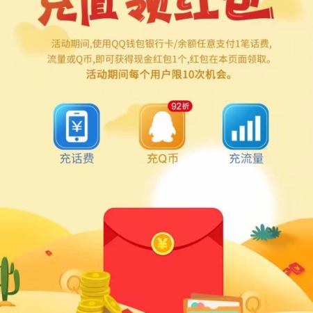 在手机QQ中,点链接,充话费/流量/Q币,最低消费1元,可以返回页面,领取现金红包,金额随机。活动期间,每个人最多领取10次。