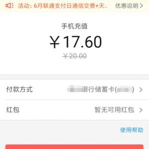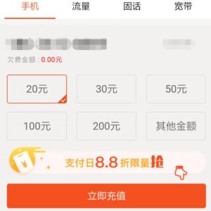 联通用户点链接,下载联通手机营业厅,进入后,用联通手机号登录,下拉,点8.8折钜惠来袭,登录沃钱包,可享受联通支付日8.8折充值活动,充值20元话费,只需17.6元。生活缴费、电影票购买、京东商城、火车票购买、网易严选都是8.8折。沃钱包积分双倍。仅限支付日当天。