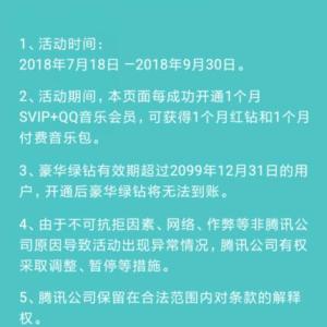 点链接,参加QQ绿钻豪华版《暑假半价专场》活动,可9.9元开通1个月QQ绿钻豪华版+1个月付费音乐包(原价15元),可90元开通1年QQ年费绿钻豪华版+1年付费音乐包(5折,原价180元)。注意:如果已经通过手机开……