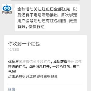 贵州燃气现金红包 金秋关注活动