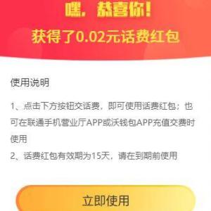 联通用户点链接,点立即领取按钮,输入手机号和验证码,可领取随机金额的话费红包,红包24小时到账。红包需要满10元才能使用。在联通手机营业厅或沃钱包APP交话费时,选择沃钱包支付时可以使用。小希只抽中了0.02元话费红包,哭唧唧,大家可以试试运气哦!