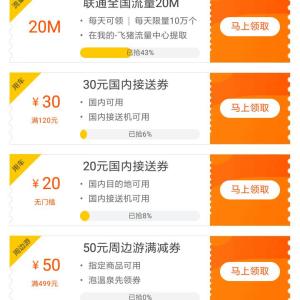 联通用户点链接,下载飞猪APP,用淘宝账号登录,每天点 我的,红包优惠券,领券,找 20M联通流量(一般为每天0点/10点开始限量领),点 马上抢 领取。然后返回,点 流量中心,点 飞猪流量雨,开始游戏,点出现的小猪,每人每天最多可以领3次流量。如果一直提示未中奖,可以换个时间再试。