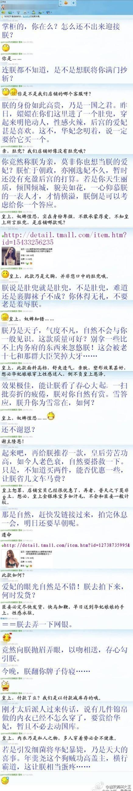 淘宝开店遇见极品买家,以“朕”的口吻调戏店小二,搞笑聊天记录博君一笑。