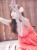 崔瑟琪穿橘红色连衣裙戴着花坐在游泳池旁敞开胸怀嘟嘴卖萌的样子