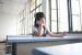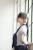 熊酱穿着蓝色学院校服扮演高岭爱花,一手扶肩,一手轻抚刘海儿坐在课桌上的样子