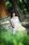 镜祭穿着白色连衣短裙扮演五更琉璃白猫,在木制栏杆的围角旁,扶着太阳帽的正面照