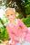 绯爱酱扮演木之本樱穿着粉色上衣与白色长裙坐在草地上微笑的样子