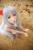 墨兔泳装扮演本间芽衣子蹲着身子玩沙,抬头看镜头