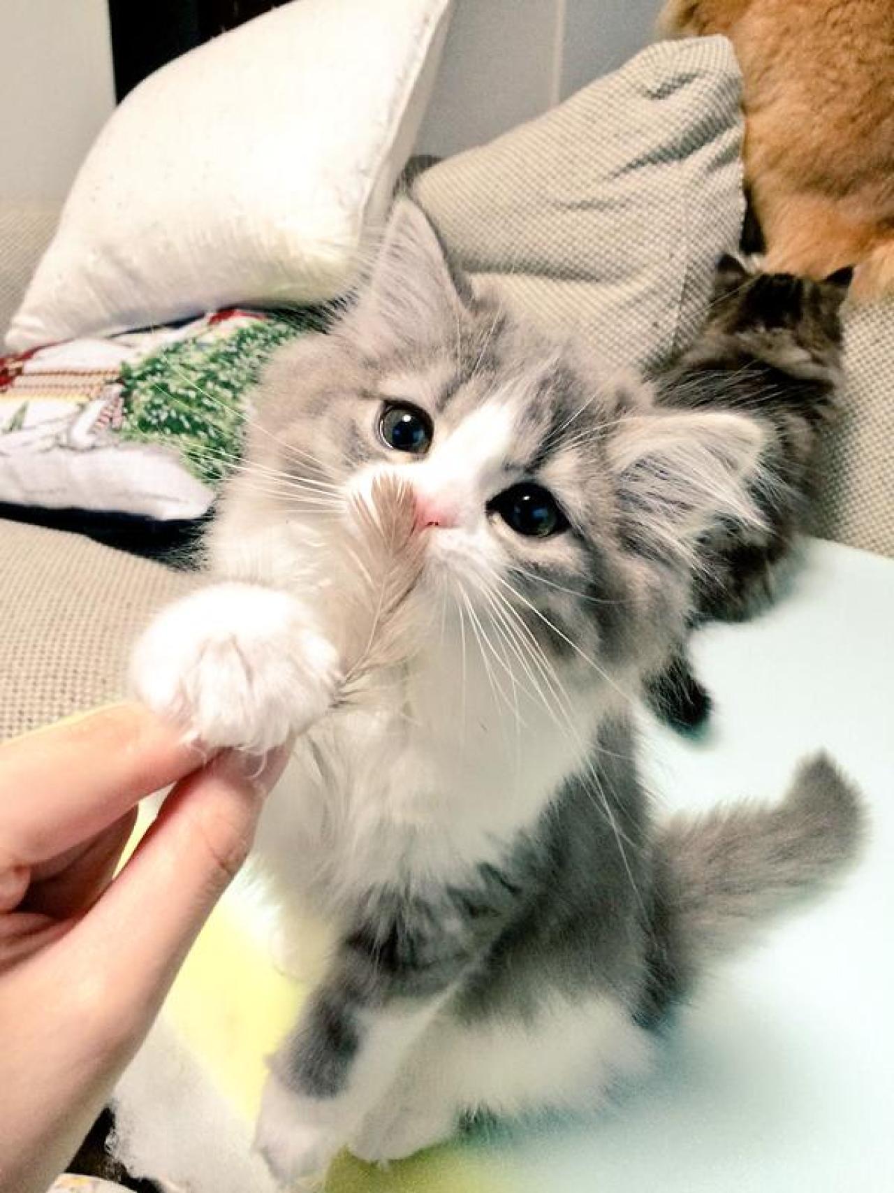 这是什么东西,我要我要!伸着双手,捧着羽毛的猫咪,萌照四连拍。
