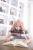 まゆふぁむ戴着兔耳朵扒在一叠书上,嘟嘴卖萌
