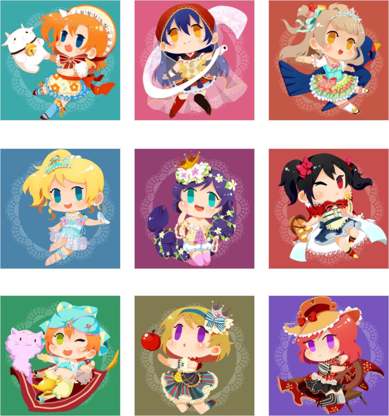 UR卡牌形象萌化,高坂穗乃果、园田海未、南小鸟、绚濑绘里、东条希、矢泽妮可、星空凛、小泉花阳和西木野真姬,《LoveLive!》童话UR卡牌萌化Q版角色头像,画师ScorpiYo作品。