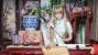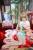 Meter扮南小鸟双手捧着荷花花束坐在红色的地毯上