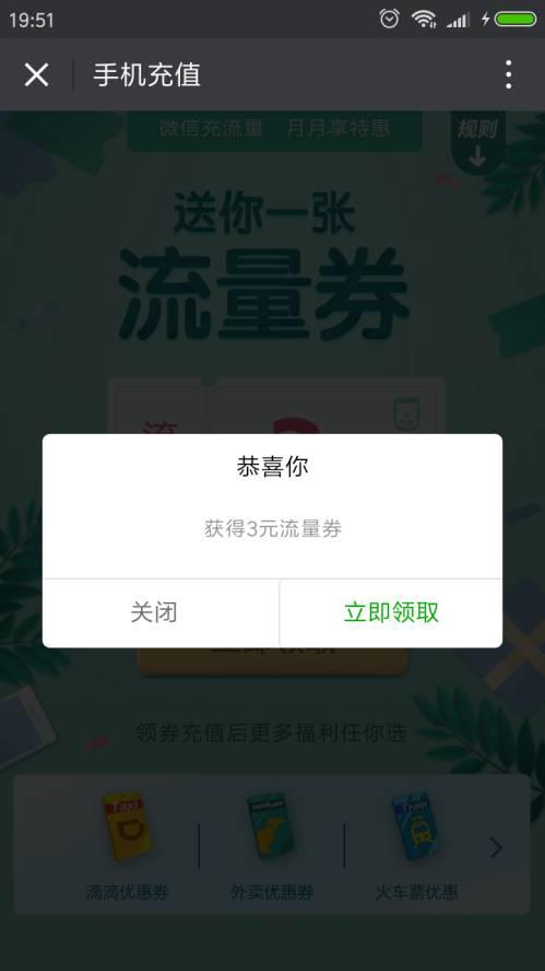手机充值微信领3元流量券