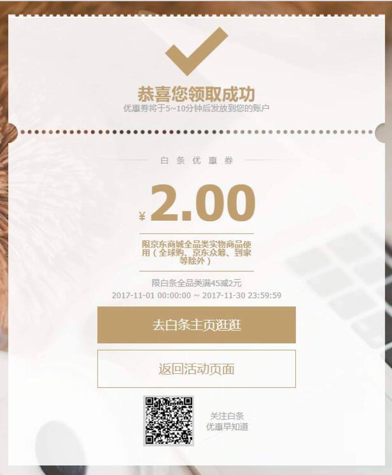 点下面的链接,先登陆京东账号,然后输入验证码,确认领取即可到账。满45元减2元,满299元减7元。京东购物时打白条可用。