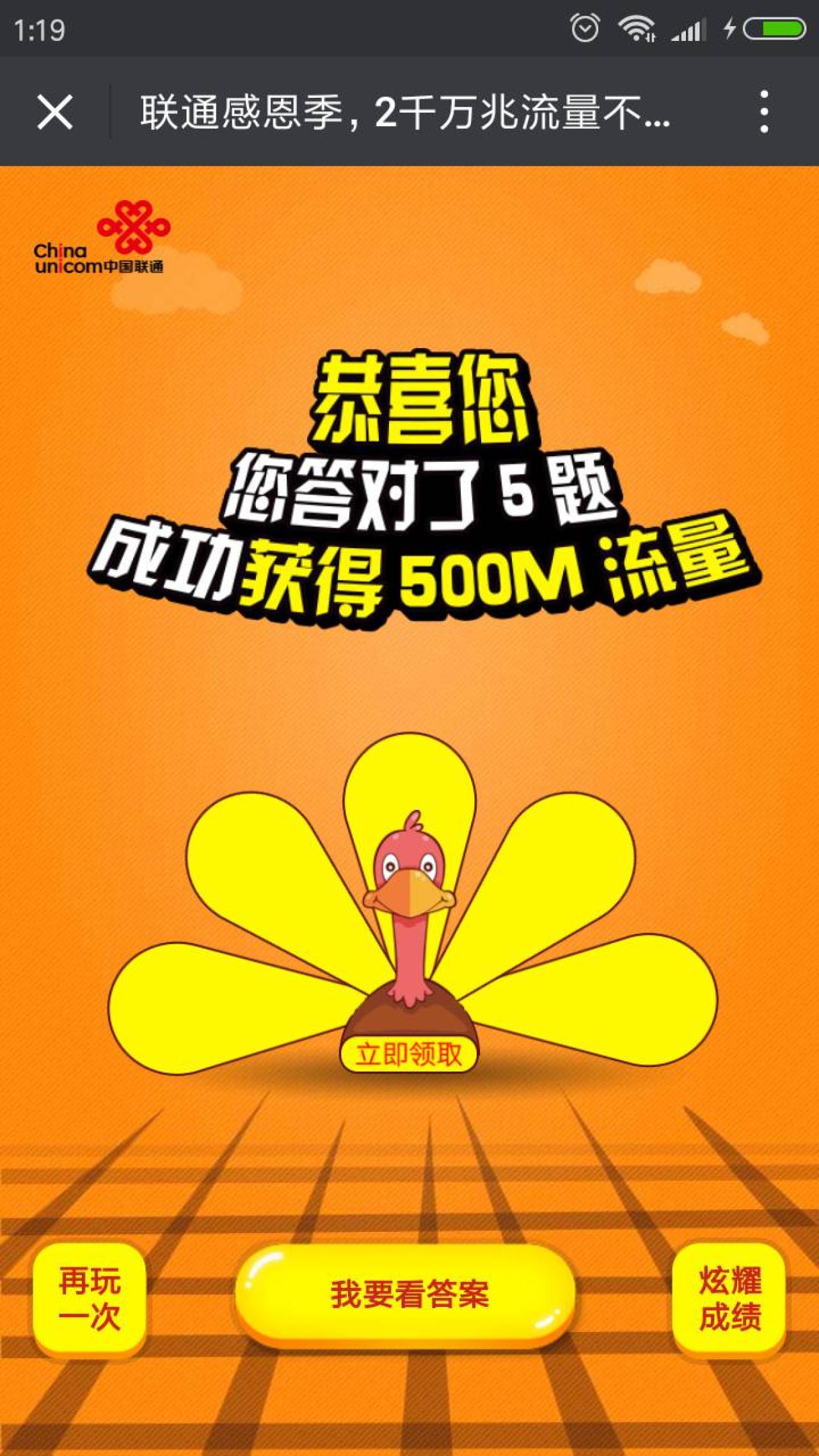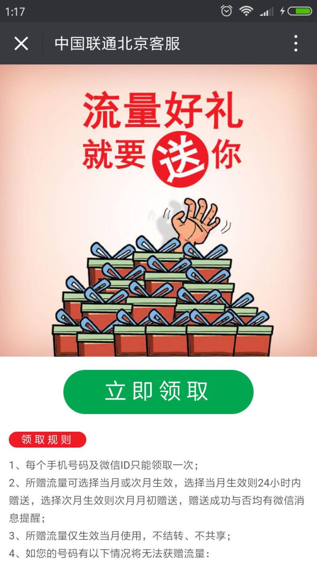 北京联通用户进入微信,点右上角+,添加朋友,公众号,搜索 中国联通北京客服,关注后,先领200M。然后再返回,点 领1G,答题可以获得500M。领取时可选当月或次月生效,只限北京联通用户哦!