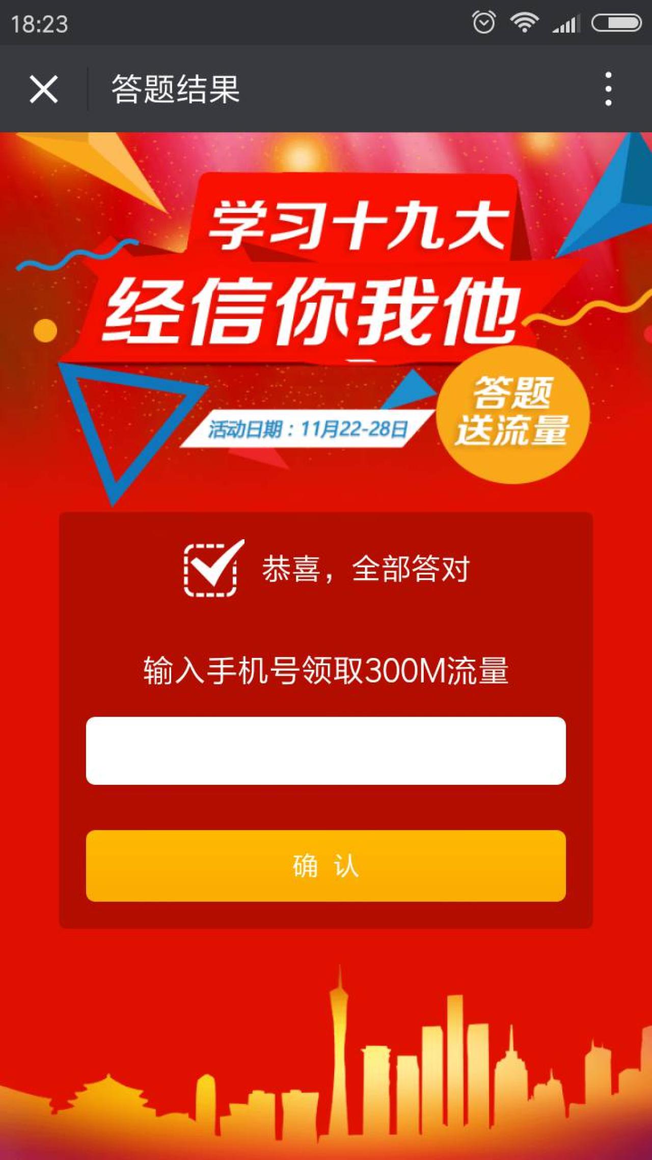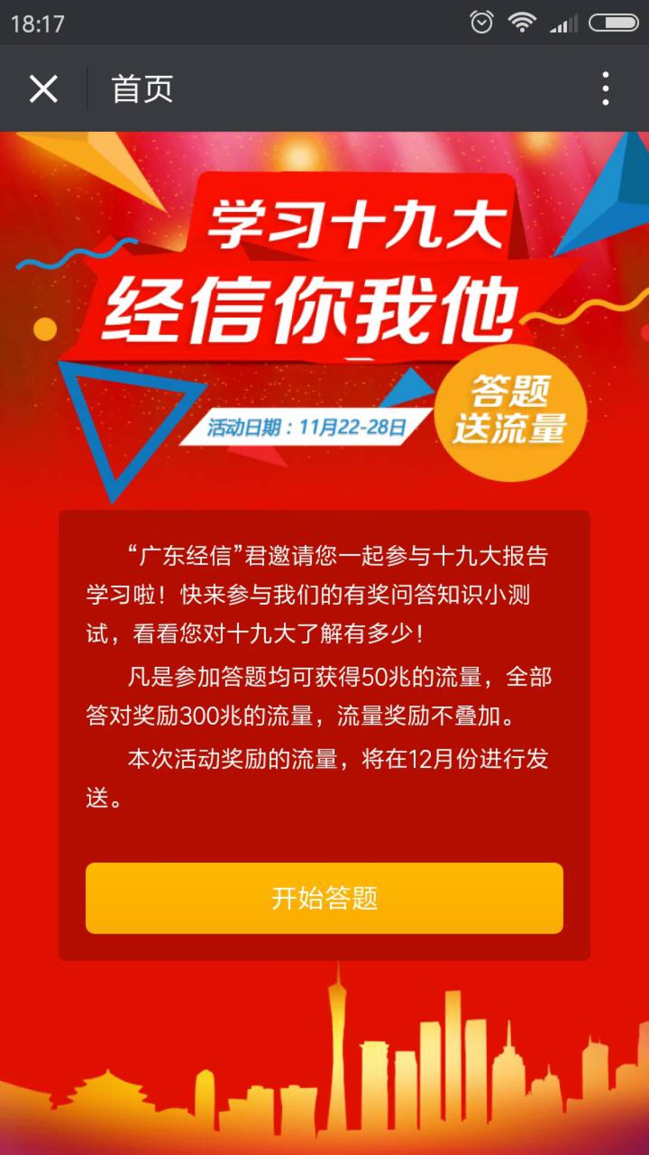 广东移动/联通/电信用户,进入微信,点右上角+,添加朋友,点 公众号,搜索 广东经信,关注。在收到的第一条信息中,点 答题链接,看过推文后,点 阅读原文,开始答题。总共10道问题,如果有一道题答错,可以获得50M流量,全部答对,可以获得300M流量。输入手机号,领取流量,下个月统一发放。仅限手机号归属地是广东省的用户参与哦!