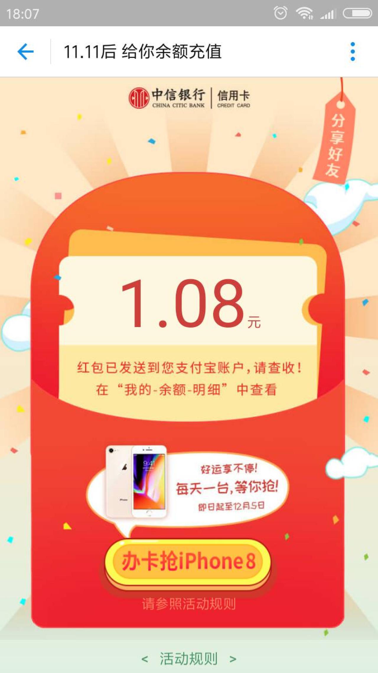 进入支付宝APP,点顶部 搜索框,搜索 中信银行信用卡,关注,点 菜单中 的领现金红包,点 推送的信息,点 拆 字,有机会领取现金红包。如果没有抽中,可以明天继续参与。活动期间,每个用户每天都有一次 拆红包 的机会。