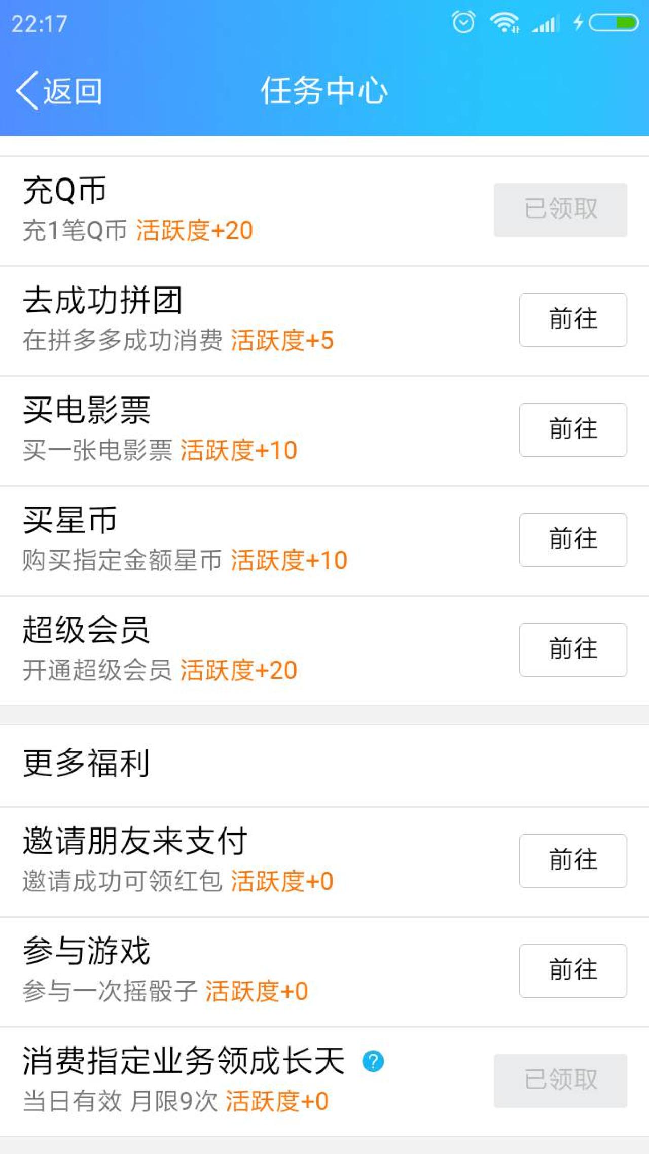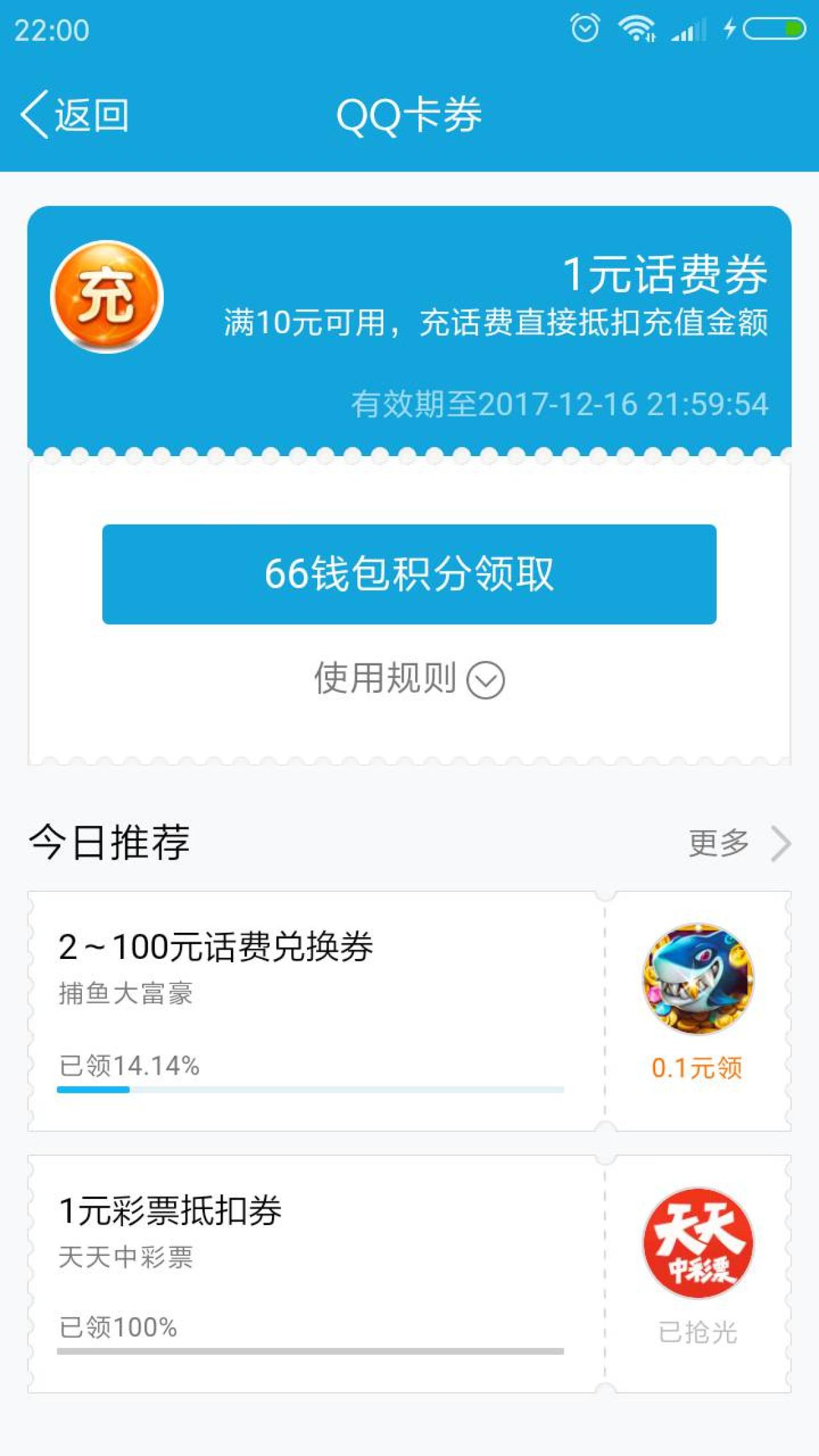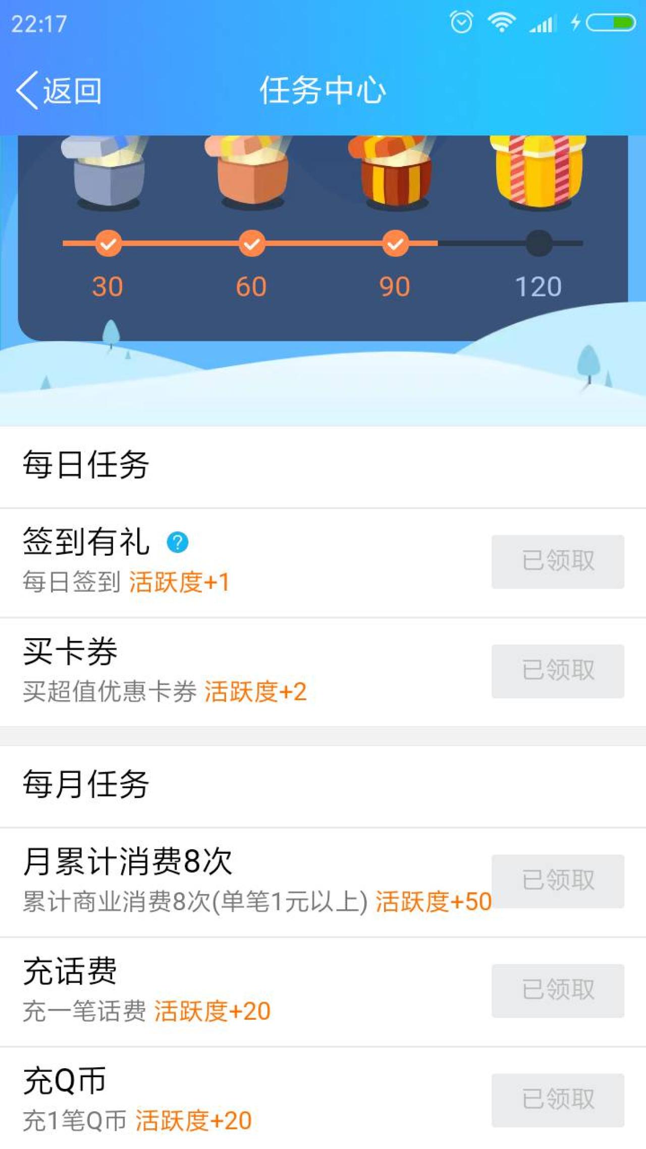 充值完后,记得返回 QQ钱包,钱包精选,任务中心,在里面领取 买卡券,充Q币,充话费,共42点活跃度,至少可以开一个30活跃度宝箱,目前开30活跃度宝箱,可以再获得 30钱包积分,火车票优惠券(这个以前没有),1元话费券。