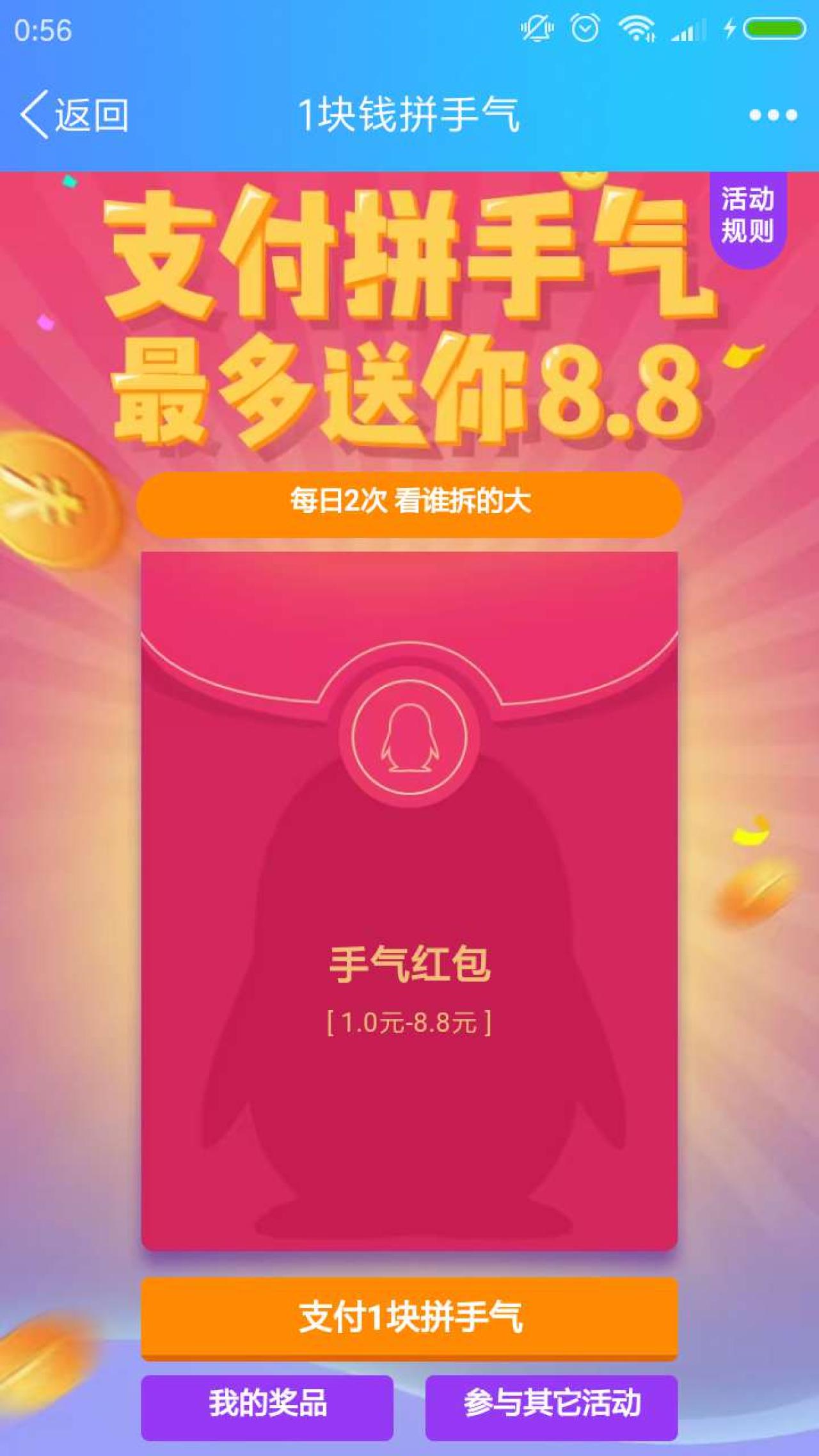 手机QQ点链接,点 支付1块拼手气,支付1元,可以抽取1.0-8.8元的红包。每人每天可以参与两次。