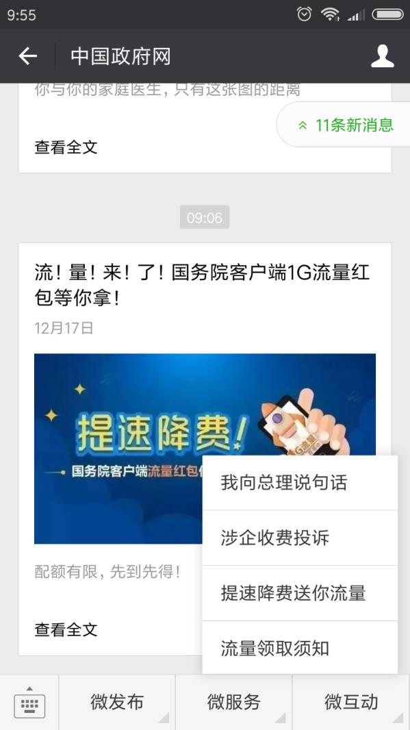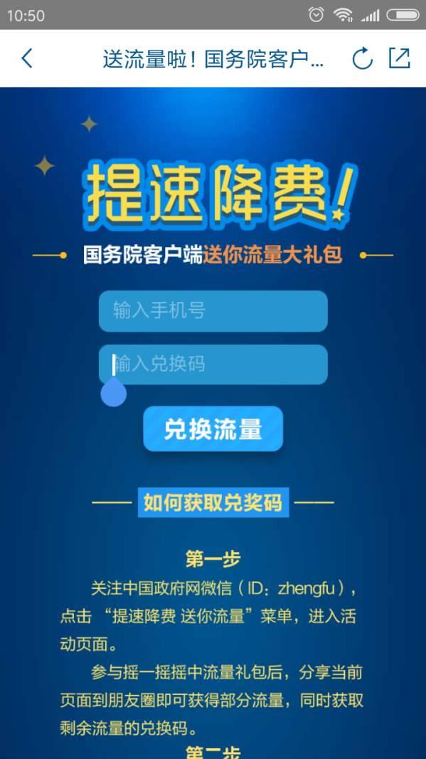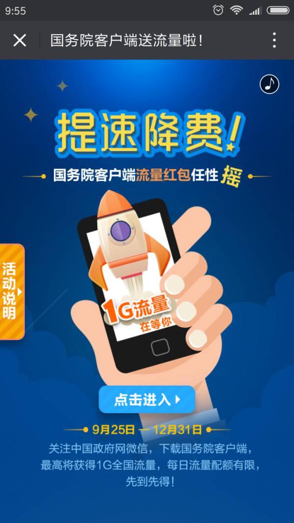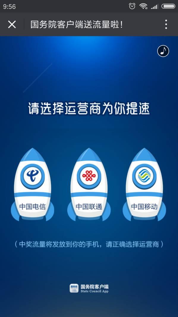 进入微信,点右上角+,添加朋友,公众号,搜索 中国政府网,关注,点 微互动,点 提速降费送你流量,稍等片刻,点击进入,选择 运营商,每人每天三次摇奖机会,每天8点开抢。如果今天没中或提示名额用完,可以明天继续,一人仅可中奖一次,次月到账。