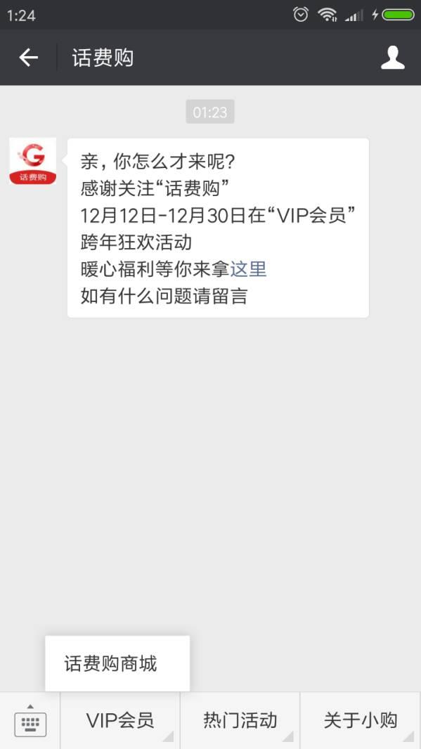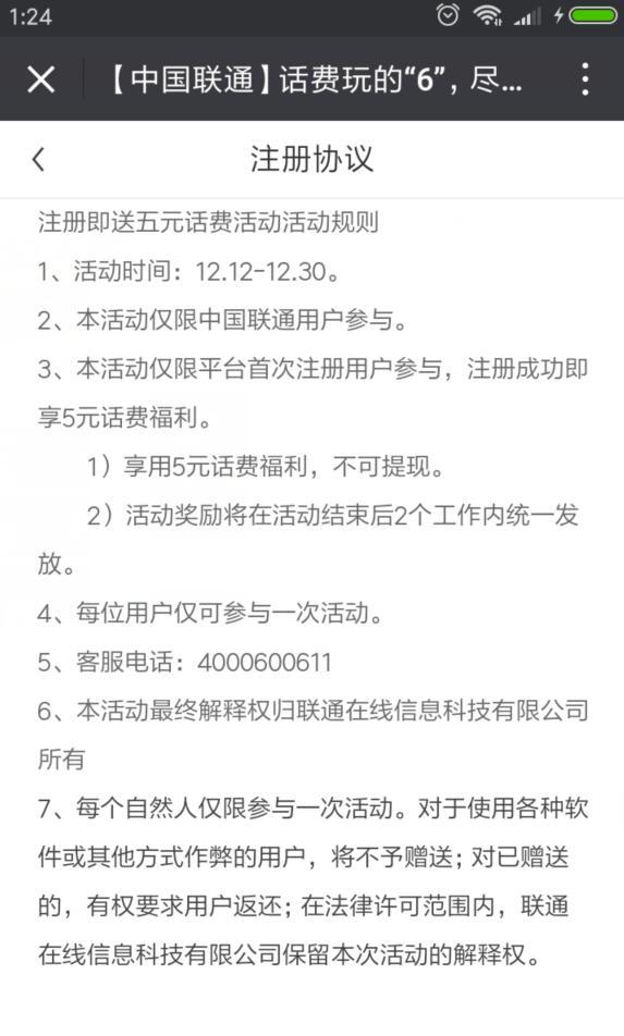 仅限联通用户:进入微信,点右上角+,公众号,搜索 话费购,关注。点 VIP会员,话费购商城,点 我的,注册 话费购。5元话费将于活动结束后,2个工作日内到账。补充:12.20发现 新用户注册就送5元话费 的横幅消失了,附上的活动注册协议。小希如果到账,会给大家补上到账图。