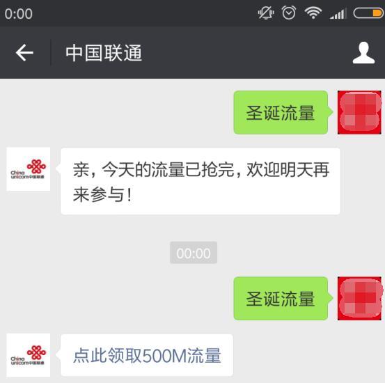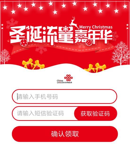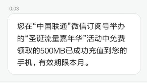联通用户进入微信,点右上角+,添加朋友,公众号,搜索 中国联通,关注后,回复 圣诞流量,点此领取500M流量。输入手机号即可领取成功。流量为国内流量,到账后立即生效,当月有效,月底清零。如果提示 流量已被抢完,25号早点再试哦!