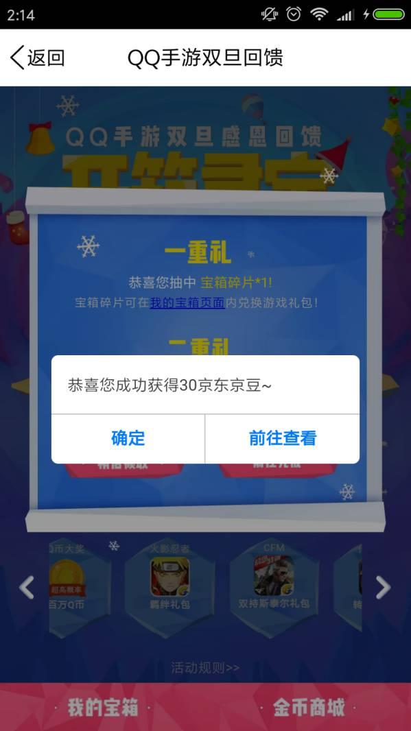 手机QQ点链接,活动期间,每人每天可以开三次宝箱。有较大概率获得Q币或京豆。小希抽中了30京豆。点 前往完成,分享到QQ群。再点 前往完成,提示 获得30京豆 后,点 前往查看,点 立即激活,这时京豆就会发送到你QQ绑定的京东账号上了。 06984717