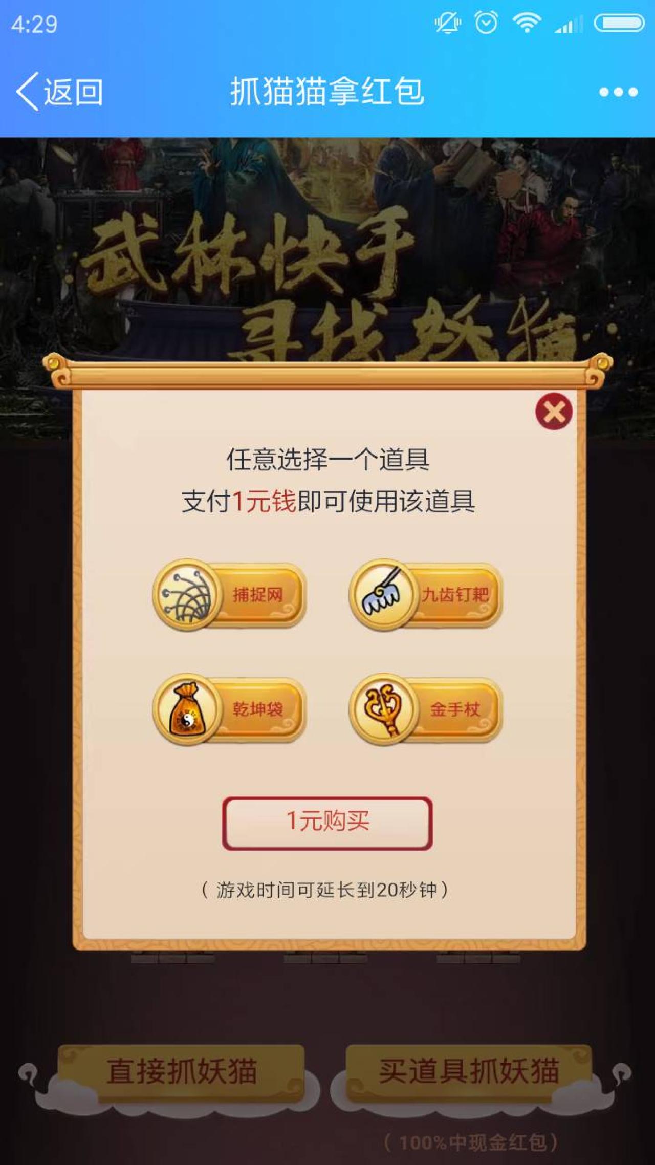 手机QQ点链接,每人每天有2次免费机会和2次买道具机会,下拉点 买道具抓妖猫,支付1元,点 出现的猫,若抓住妖猫,可获得大于1元红包。若没抓住,可获得1元红包。游戏很简单,大家都能抓住妖猫,得现金红包。