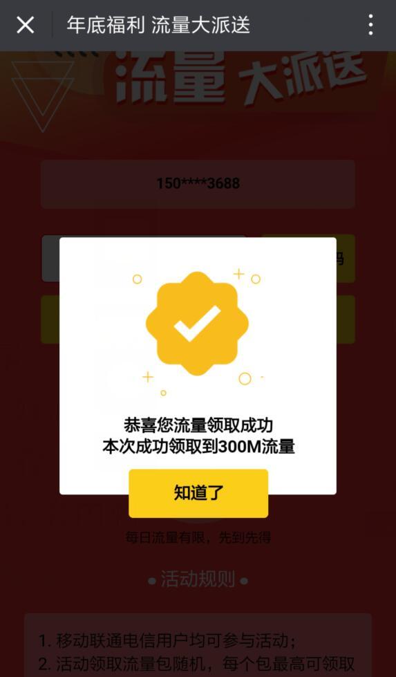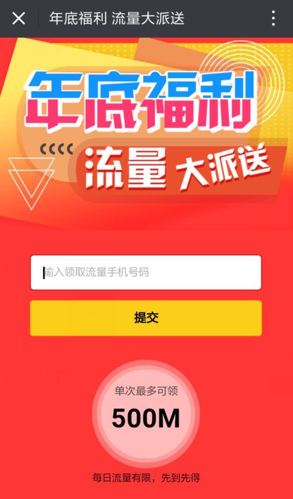 进入微信,点右上角,添加朋友,公众号,搜索 人民日报,关注后,点 右上角 送流量,点右上角,将活动分享到朋友圈后,输入手机号,点提交,即可领取300M流量,流量当月有效。电信、联通、移动用户均可参与,如果提示流量领完,可以等 人民日报 微信推送 送流量 的信息时,再重复刚才的步骤领取。