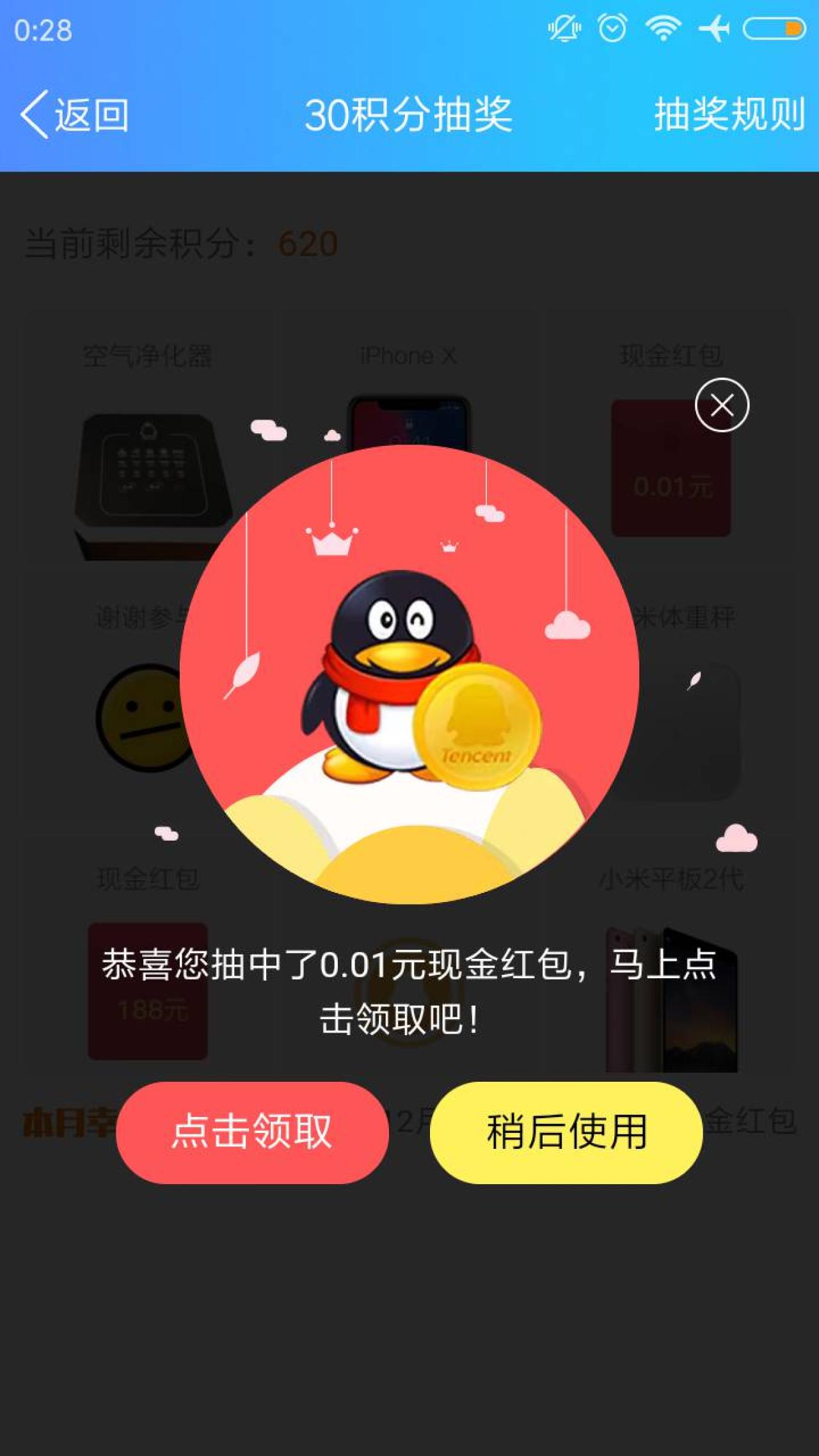 QQ钱包积分将在明天0点过期,进入手机QQ,点自己的头像,点QQ钱包,点账户,积分商城,可以将自己剩余的积分消耗掉。还可以参与积分抽奖,30积分抽一次,小希抽了22次,只中了0.01元红包。中奖概率较低哦!