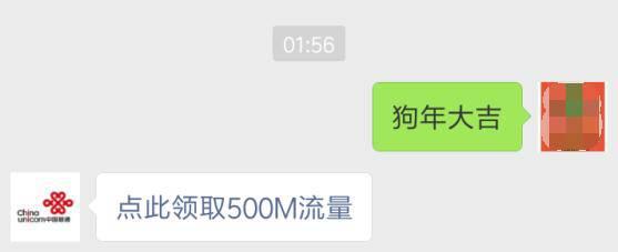 联通用户进入微信,点右上角+,添加朋友,公众号,搜索 中国联通,关注后,回复 狗年大吉,点此领取500MB流量,输入手机号和验证码,点 确认领取,可以领取500M联通国内流量,当月有效。注意:500M流量为后置流量,优先消耗套餐内的流量,之后才会消耗这500M流量哦!