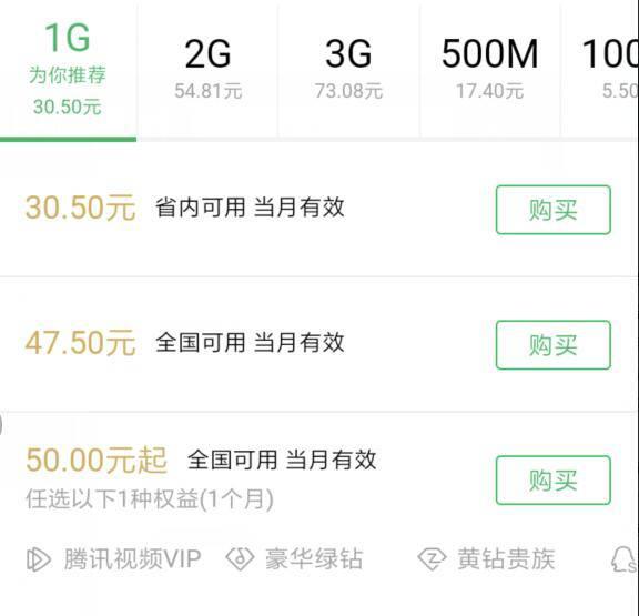 进入微信,点 我,钱包,手机充值,输入 手机号 后,点 更多流量包。充值1GB流量,可能会出现优惠套餐选项,可以搭配一个月的 腾讯视频VIP/豪华绿钻/黄钻贵族/QQ超级会员,任选其一,享受优惠套餐。