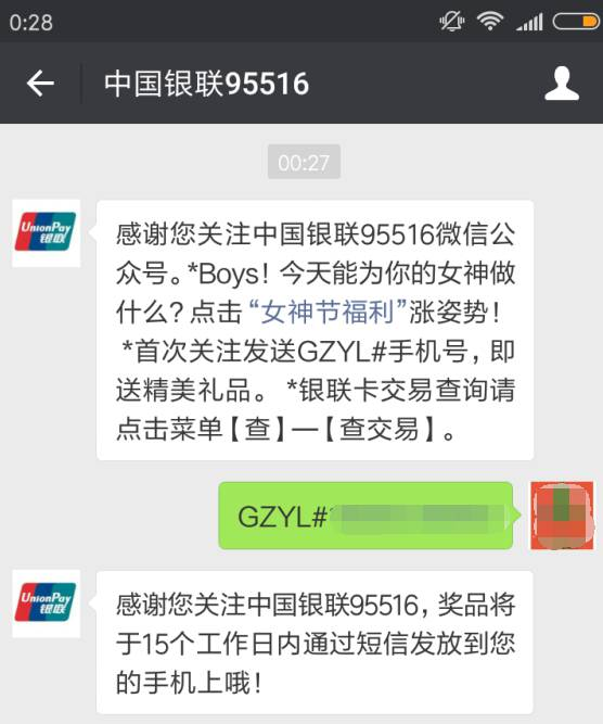 进入微信,点右上角+,添加朋友,公众号,搜索 中国银联95516,关注后,回复 GZYL#你的手机号,可以领取礼品一份,15个工作日内发放。小希刚刚领,还不知道礼品是什么呐~