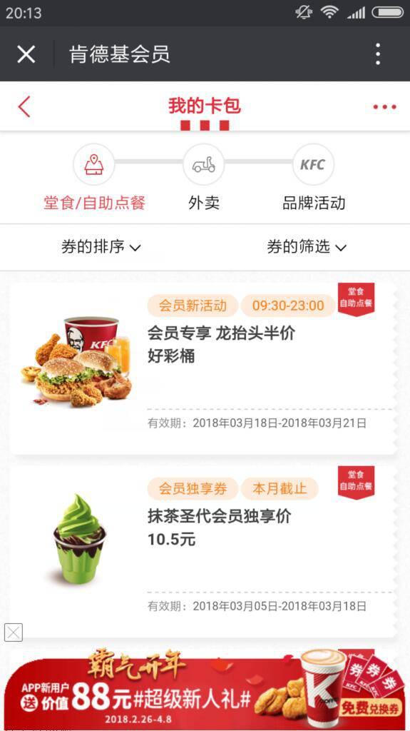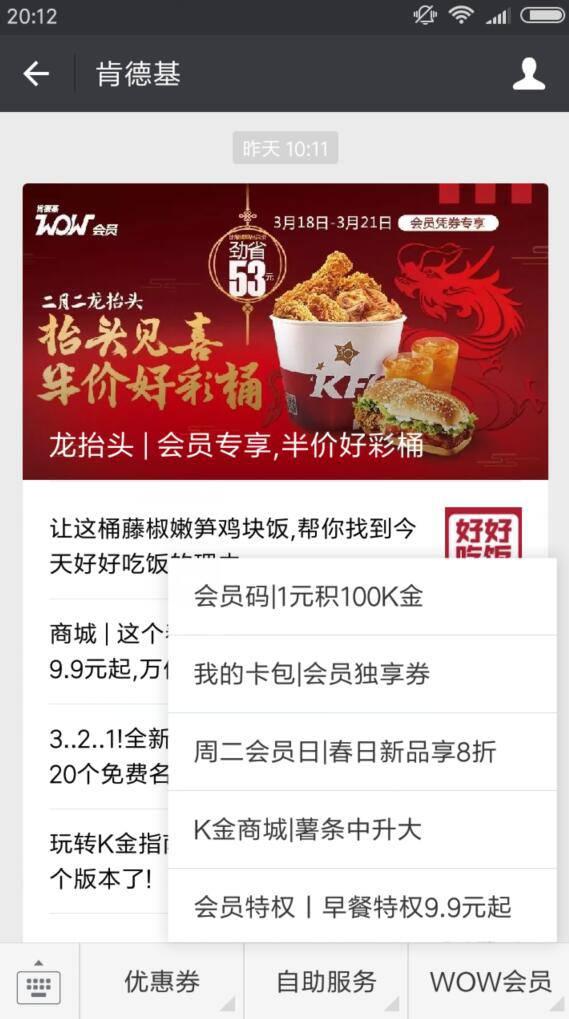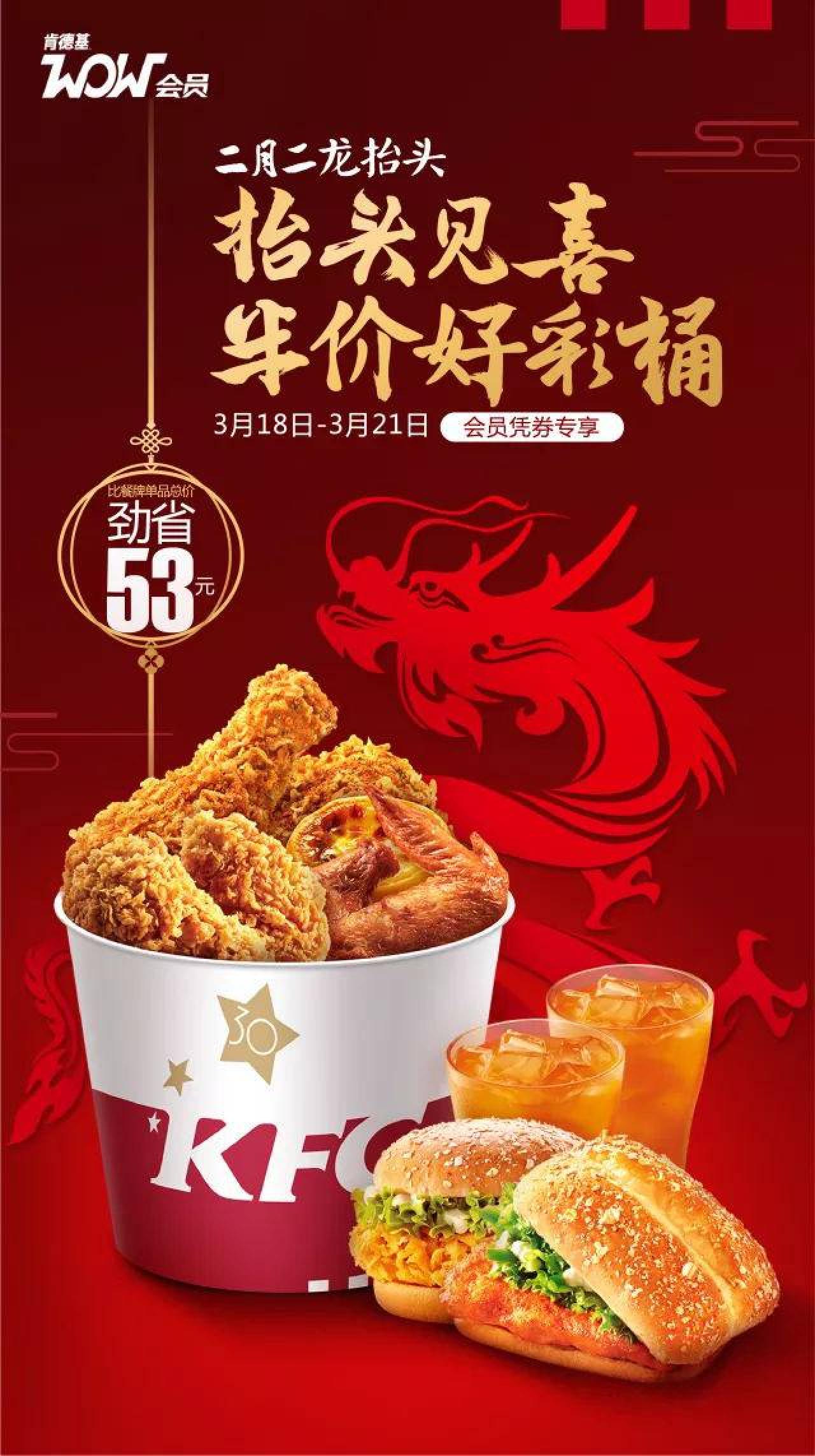 进入微信,点右上角+,添加朋友,公众号,搜索 肯德基,关注后,点右下角WOW会员,我的卡包|会员独享券,领取 龙抬头半价好彩桶券,可以5折扣购买 好彩桶,包括:香辣鸡腿堡、新奥尔良烤鸡腿堡、避风塘热辣脆皮鸡2块、香辣鸡翅2块、新奥尔良烤翅2块、经典葡式蛋挞、九珍果汁饮料2杯。