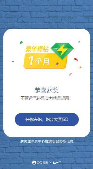 点链接,前往答题,登录QQ音乐,回答关于跑步和听音乐的三道问题。全部答对后,点去抽奖,立即抽奖,有较大概率获得1个月的豪华绿钻+1个月的付费音乐包,大家可以试试运气哦!