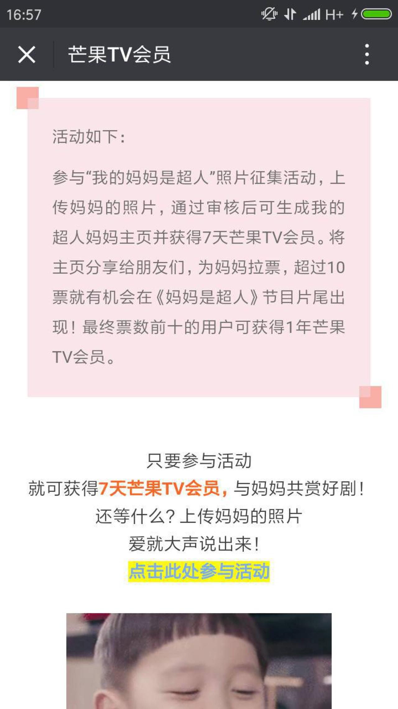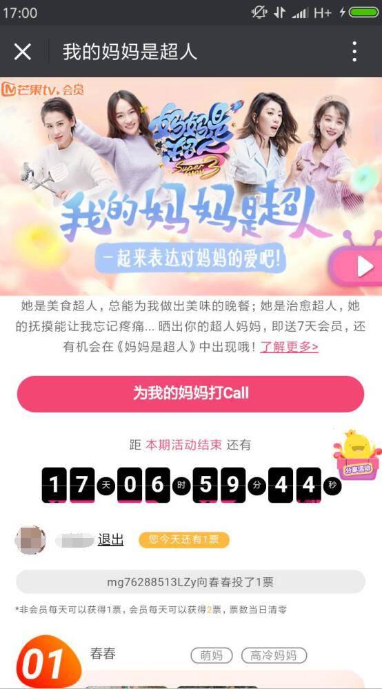 进入微信,点右上角+,添加朋友,公众号,搜索 我的妈妈是超人,关注后,点右上角,点历史消息,点【我的妈妈是超人】,下拉,点击此处参与活动,点 登录,登录芒果TV,点 为我的妈妈打Call,填你妈妈的昵称,超能力,贴标签,并且上传3张妈妈的照片,提交。审核通过后,可得7天芒果TV会员。