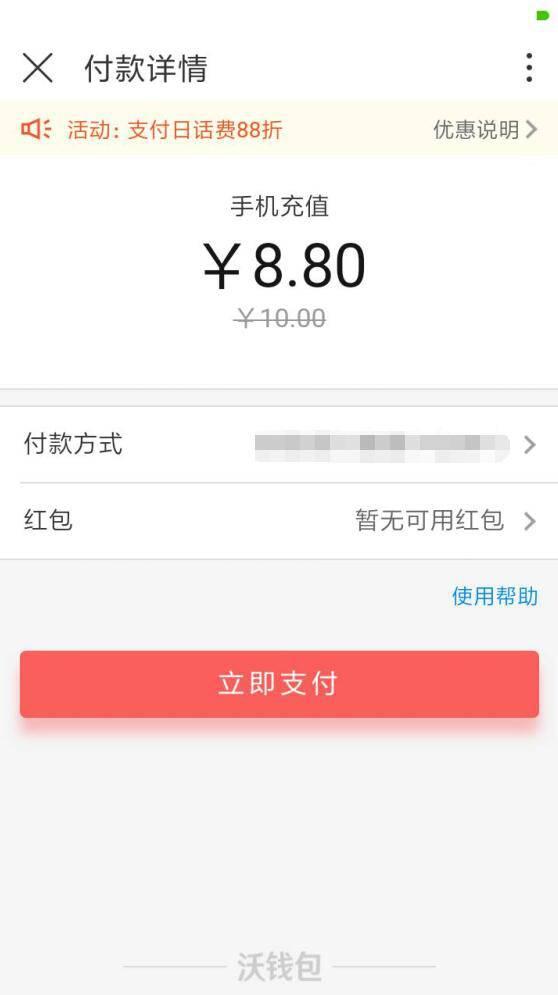 联通用户点链接,下载沃钱包或手机营业厅,安装后打开登录,在3月28日当天,可享受充话费8.8折(最高减10元),买火车票8.8折(最高减50元),缴水费、电费、燃气费、供暖费8.8折(最高减20元)。所有交易双倍积分。注意:活动限制人数,大家点 立即充值 后,注意核对下是否已经打折,再确认支付。