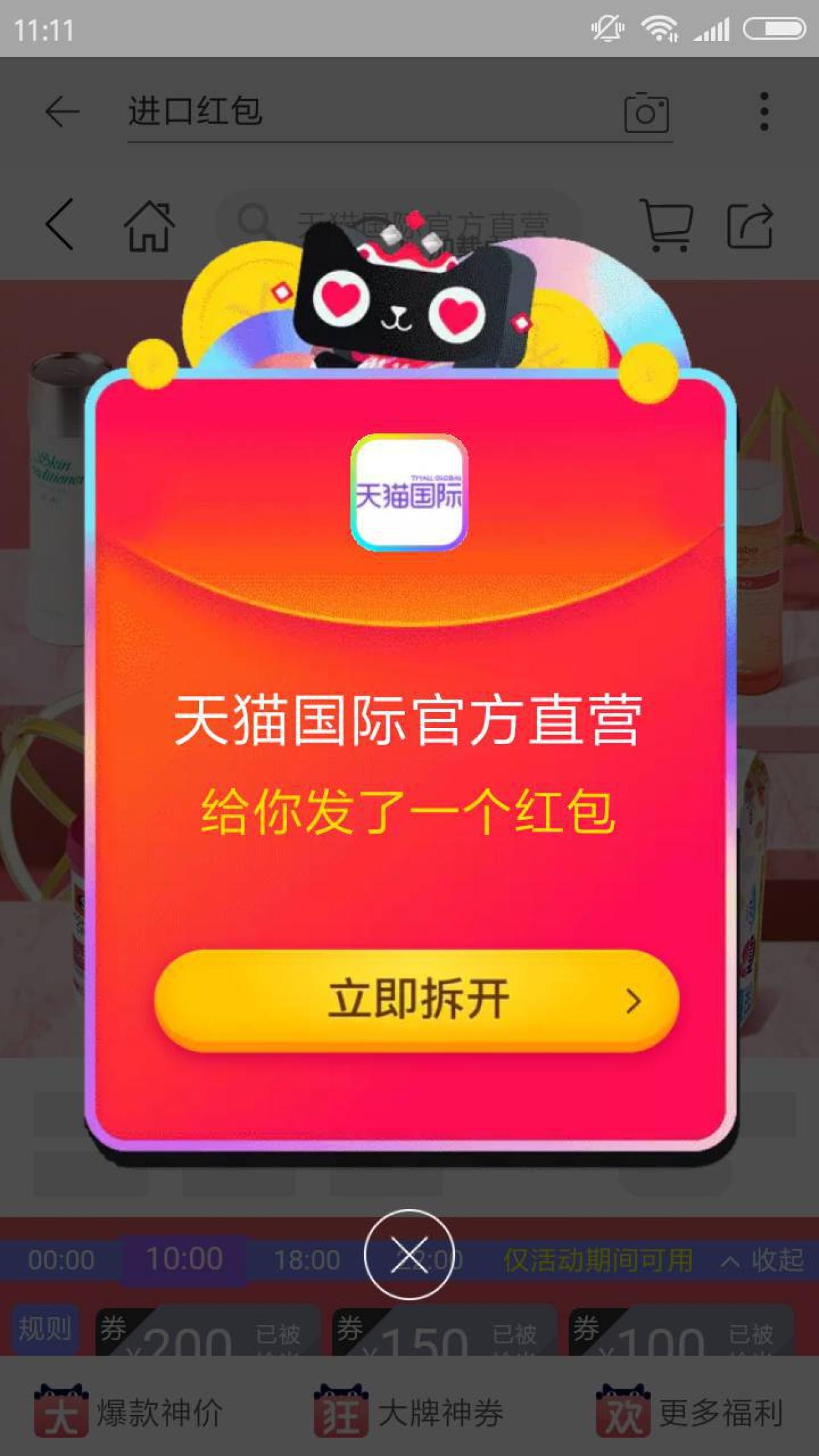 进入淘宝或天猫APP,搜索 进口红包,可领取 天猫国际官方自营店,10元红包。红包可在天猫国际官方自营店购物时,抵扣现金,全场通用,自领取之日起,3天有效。如果今天没领到,明天可再领。
