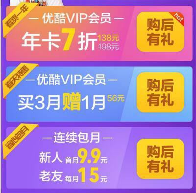 点链接,买优酷VIP会员年卡,打7折138元(原198元),买优酷VIP季卡,56元,送一个月。开通连续包月(每月自动续费),新人首月9.9元,老友每月15元。活动期间成为VIP,可抢380元元尊礼包,可领380元元宠礼包,礼包内容都是天猫淘宝优惠券,购买会员可增加2次抽奖机会。