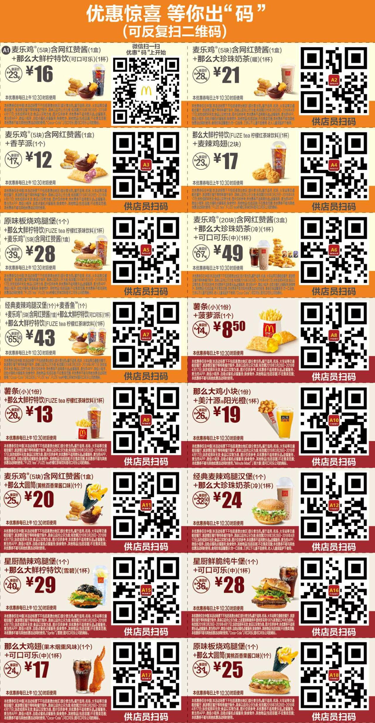 手机横屏查看更清晰!每日上午10:30之后,在非火车站、机场等交通枢纽、旅游景区等特殊餐厅外的麦当劳,向点餐员出示优惠券,可请店员扫码,也可直接报优惠券二维码上的编号,如A12。可以优惠券价格购买指定套餐。
