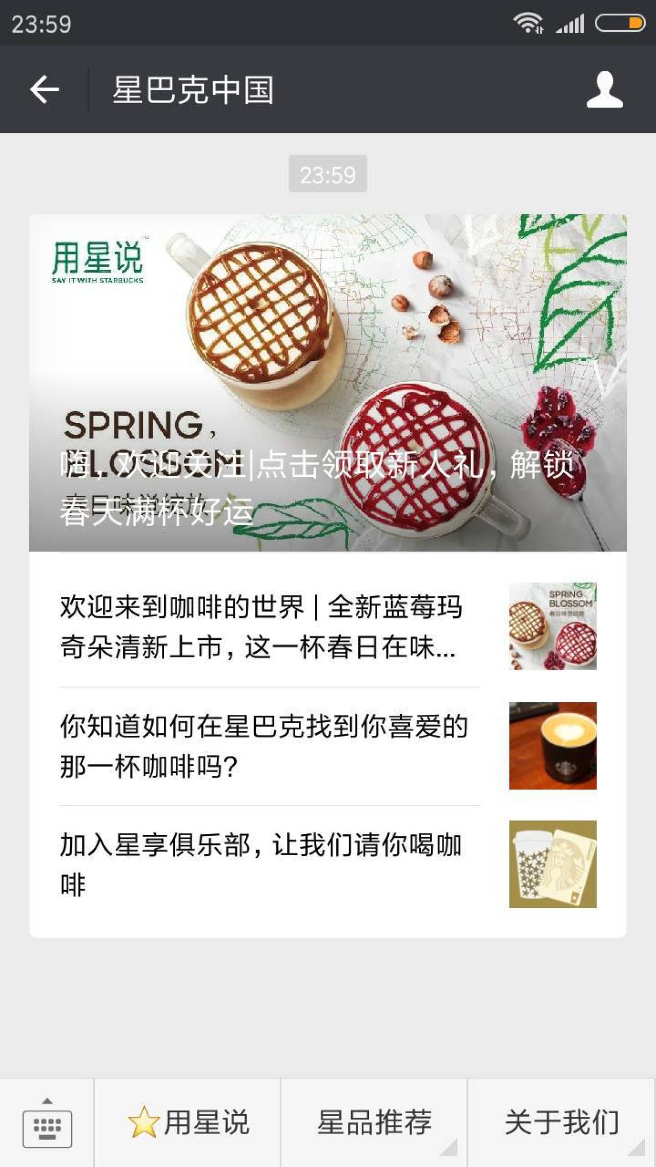 进入微信,点右上角+,添加朋友,公众号,搜索 星巴克中国,关注后,点推送的消息,点击领取新人礼,星巴克微信支付代金券8元,在星巴克消费,满8元,使用微信支付,可抵扣8元。代金券到4月23日失效。