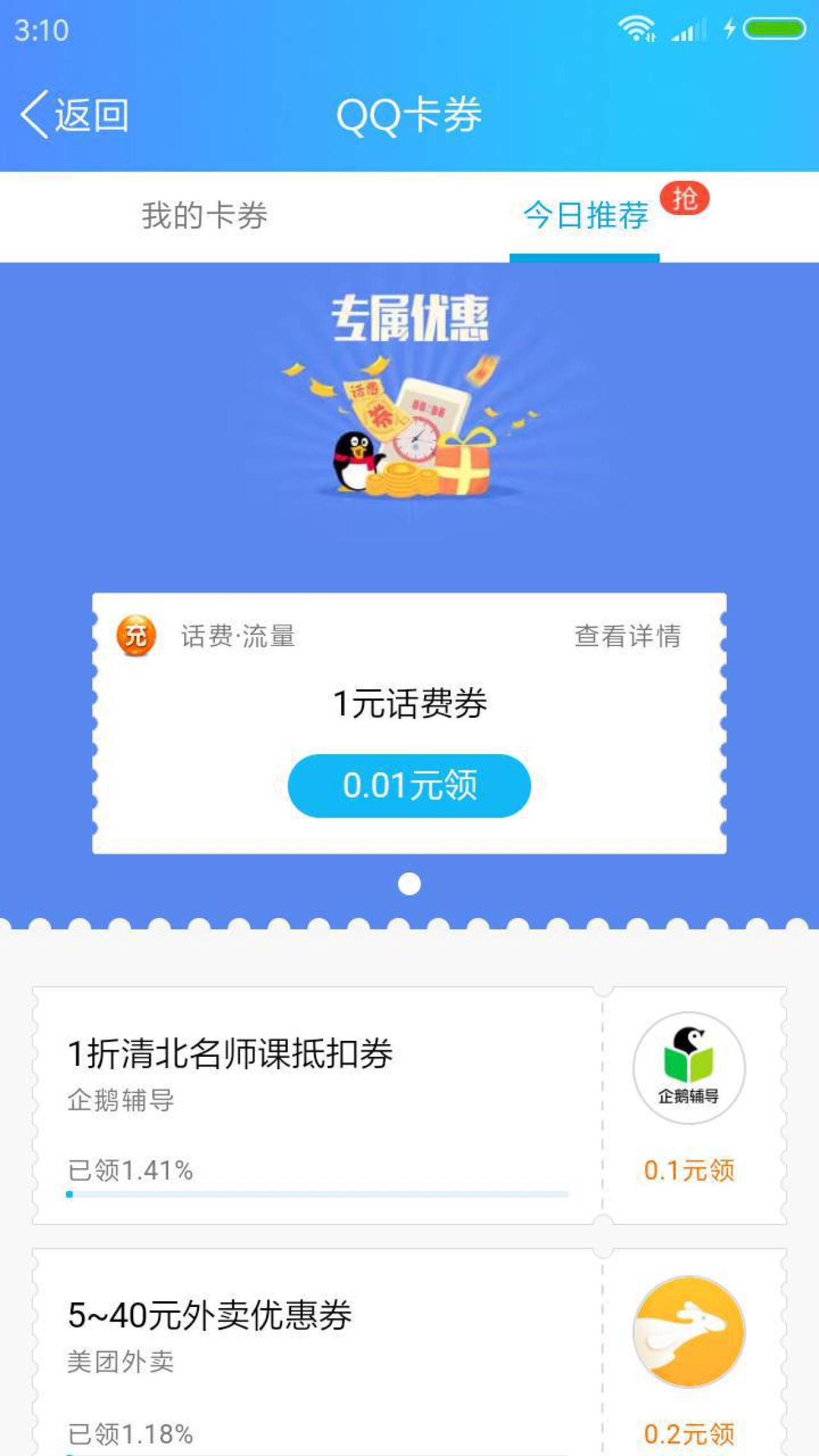 进入手机QQ,点你的头像,QQ钱包,拖动上方横幅,找到“话费福利来袭”,支付0.01元可领取1元话费券,充值话费满10元可抵扣1元。话费券自领取之日起,3天有效。