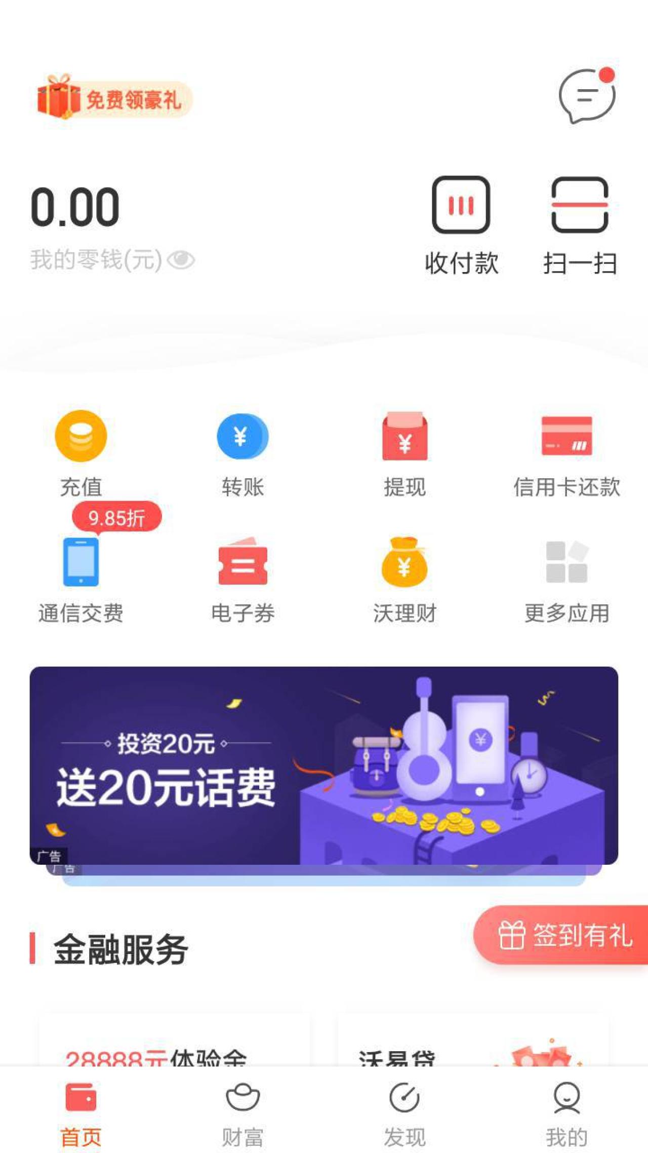 未在沃钱包投资过的联通用户点链接,下载沃钱包APP,登录后在首页中部找到 投资20元送20元话费,点马上领取,立即办理,完成投资风险测评,输入真实姓名、身份证号、银行卡号,支付20元买 玖富乐享(365……